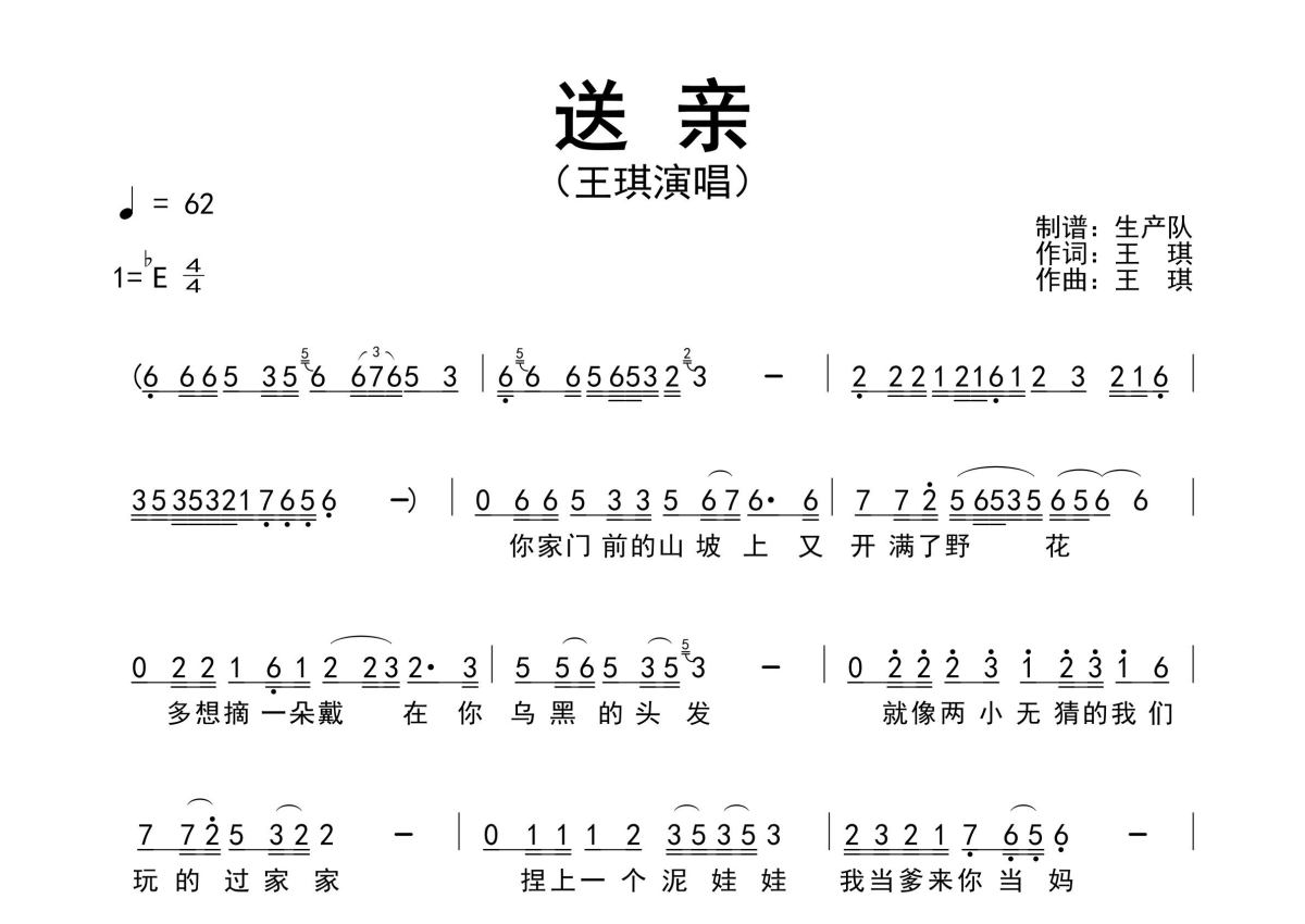 《送亲》是王琪演唱的一首歌曲,原版简谱,拍号为4/4拍,歌曲速度为每分钟62拍,这份简谱共有两张高清图谱,图谱由 @生产队 编配上传王琪作词、作曲并演唱的经典歌曲《送亲》原版简谱,完整的前奏、间奏、尾奏solo编配,精编完美版,致敬经典!。