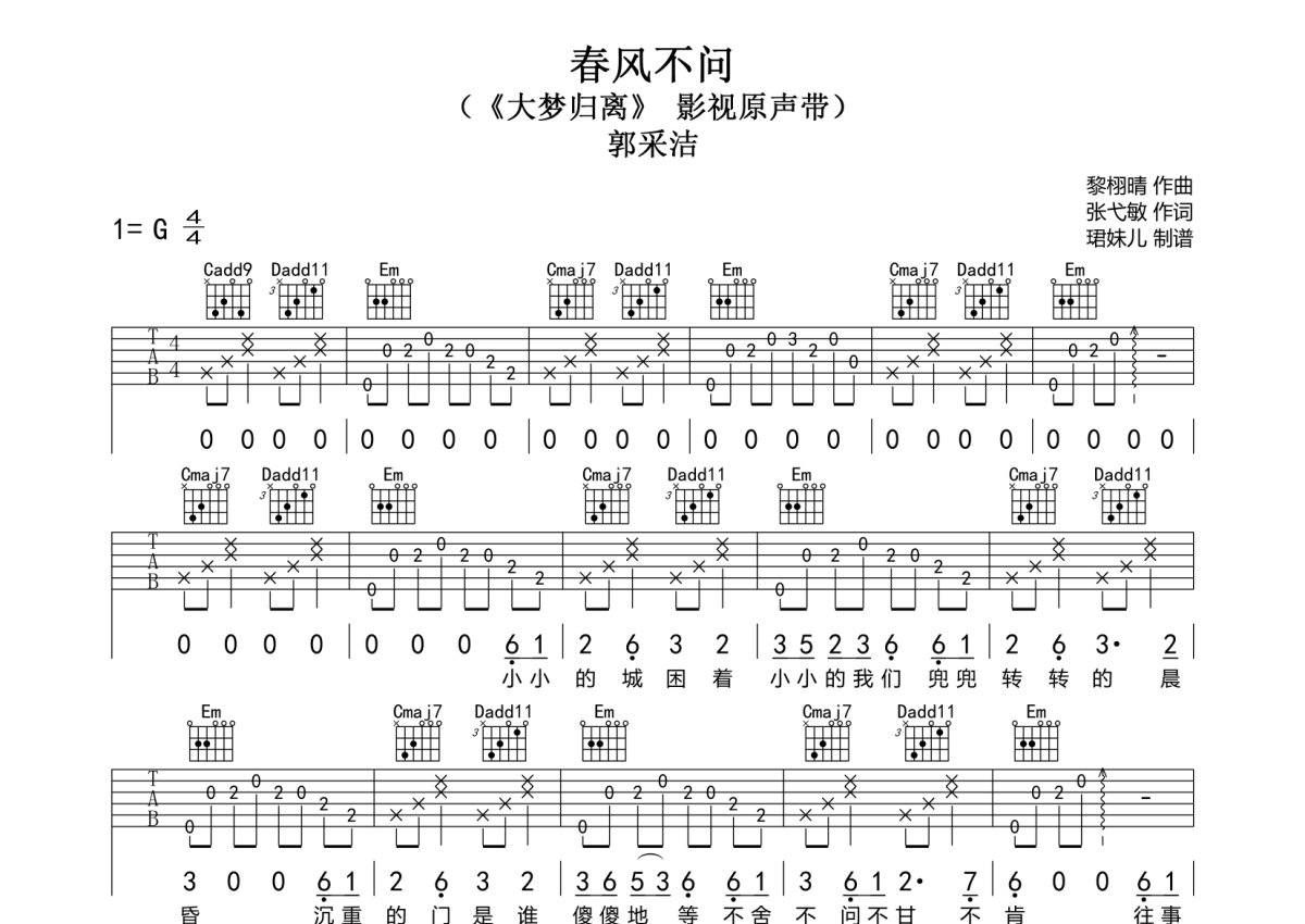 郭采洁《春风不问》吉他谱 - G调弹唱六线谱