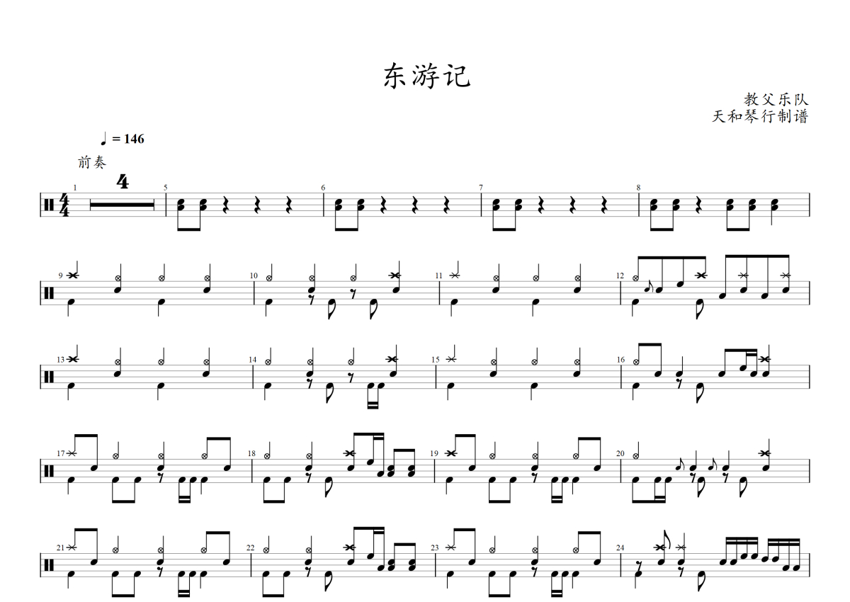 《东游记》是教父乐队演唱的一首歌曲,拍号为4/4拍,歌曲速度为每分钟146拍,这份架子鼓谱共有三张高清图谱,图谱由 @音符喷血者 编配上传,图谱使用五线谱编配,使用这份东游记架子鼓谱,你将能够轻松地敲打出这首教父乐队的东游记,快来尝试吧。