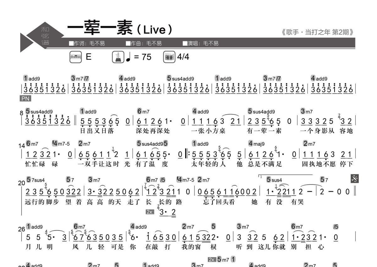 《一荤一素》是毛不易演唱的一首歌曲,数字级数和弦谱,拍号为4/4拍,歌曲速度为每分钟75拍,这份简谱共有一张高清图谱,图谱由 @老杨教吉他 编配上传【歌曲信息】Key:E Tempo:4/4 每分钟75拍。 【整理信息】按原曲完整整理。 【和弦标记】数字级数。 【和弦难度】大、小三和弦,小、半减、属七和弦,加九、大九和弦,挂留和弦,Slash和弦。