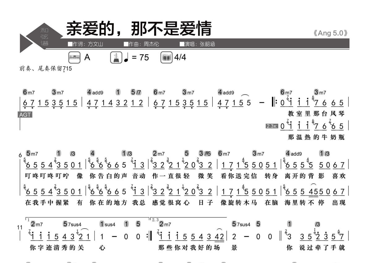 《亲爱的,那不是爱情》是张韶涵演唱的一首歌曲,数字级数和弦谱,拍号为4/4拍,歌曲速度为每分钟75拍,这份简谱共有一张高清图谱,图谱由 @老杨教吉他 编配上传【歌曲信息】Key:A Tempo:4/4 每分钟75拍。 【整理信息】按原曲完整整理。 【和弦标记】数字级数。 【和弦难度】大、小三和弦,小、属七和弦,加九和弦,转位/Slash和弦,挂留和弦。