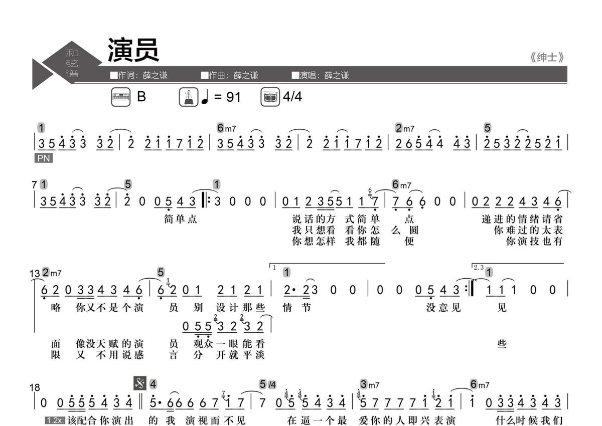 《演员》是薛之谦演唱的一首歌曲,数字级数和弦谱,拍号为4/4拍,歌曲速度为每分钟91拍,这份简谱共有一张高清图谱,图谱由 @老杨教吉他 编配上传【歌曲信息】Key:B Tempo:4/4 每分钟91拍。 【整理信息】按原曲完整整理。 【和弦标记】数字级数。 【和弦难度】大、小三和弦,大、小、尾七和弦,转位/Slash和弦。