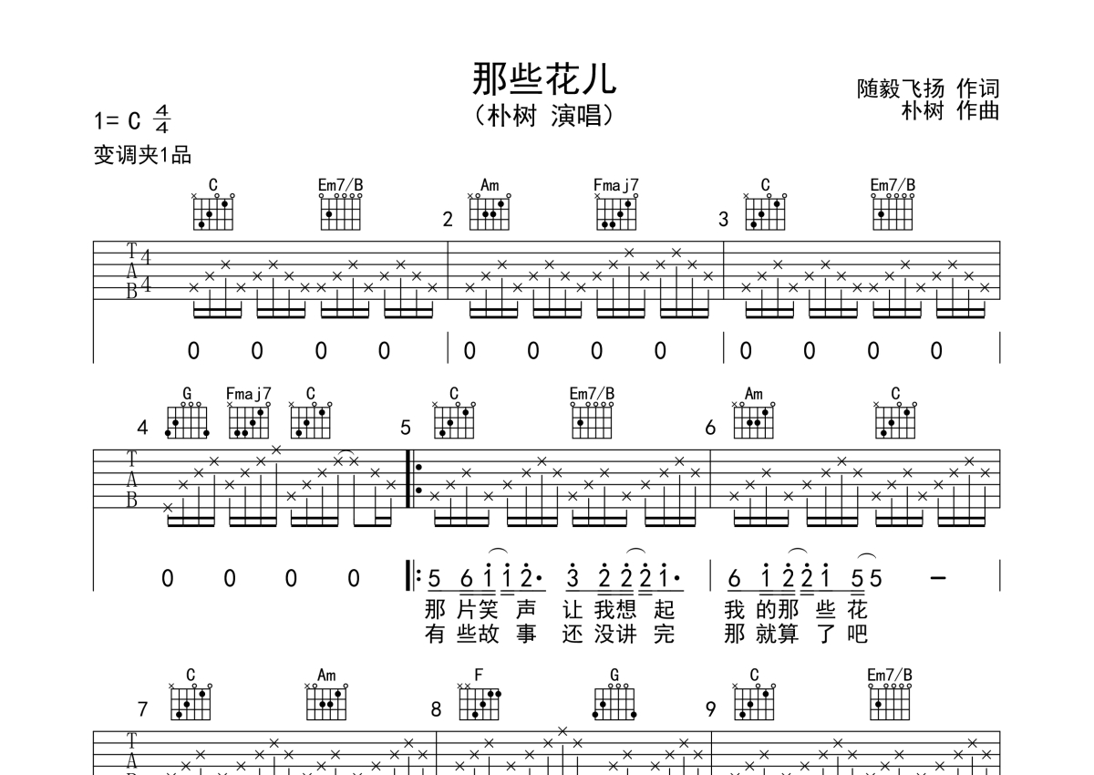 《那些花儿》是朴树演唱的一首歌曲,本吉他谱采用的是C调指法编配,这份吉他谱共有两张高清图谱,图谱由 @胡sir音乐 编配上传,图谱使用六线谱编配,包含吉他和弦指法、简谱以及歌词部分,使用这份那些花儿吉他谱,可以让你更加方便地掌握这首歌曲的弹唱技巧,快来尝试吧。本谱调为 C 调指法;《那些花儿》,是中国内地男歌手朴树演唱的一首歌曲,朴树亲自作词作曲,收录于朴树1999年发行的首张个人专辑《我去2000年》中,同时也是2002年电影《那时花开》的片尾曲。