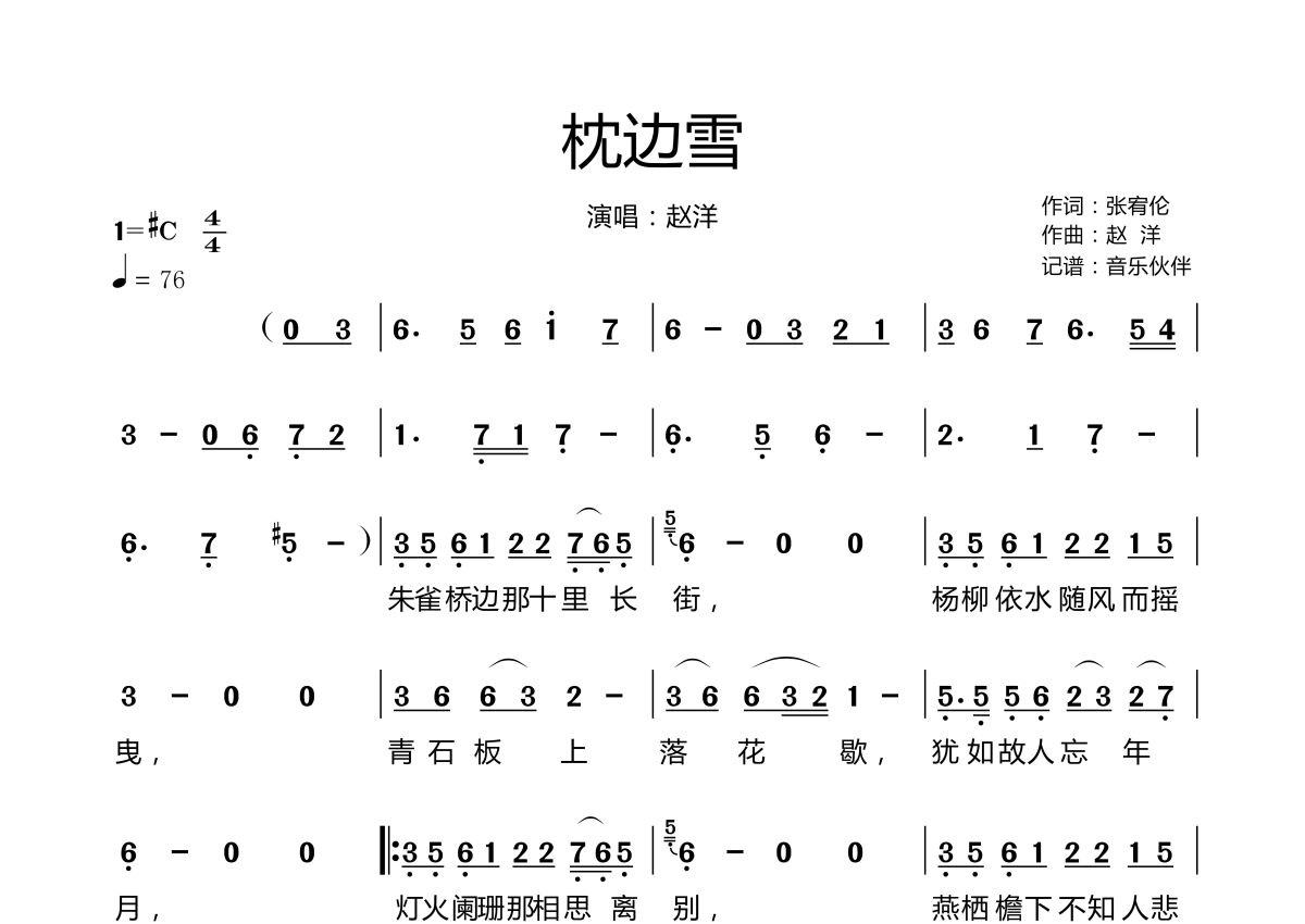 枕边雪简谱 - 赵洋演唱