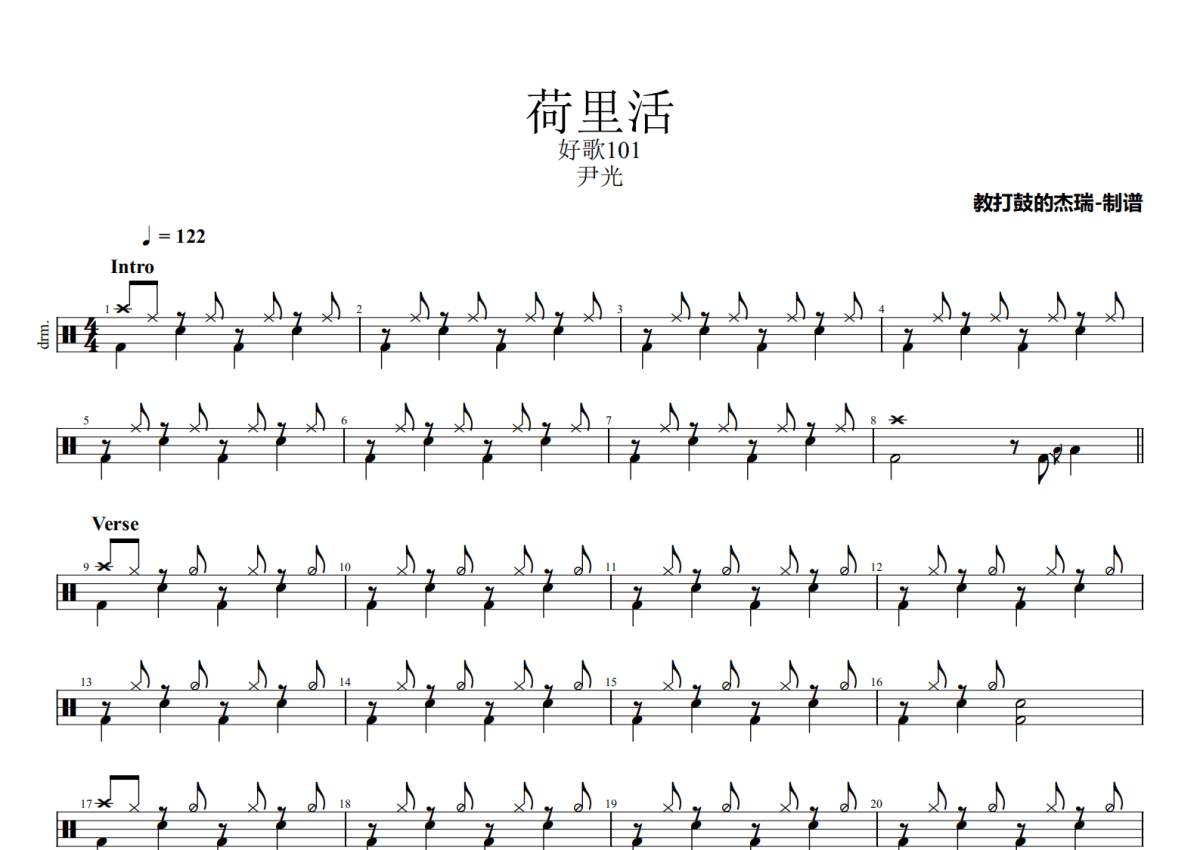 《荷里活》是尹光演唱的一首歌曲,拍号为4/4拍,歌曲速度为每分钟122拍,这份架子鼓谱共有两张高清图谱,图谱由 @Jerry 编配上传,图谱使用五线谱编配,使用这份荷里活架子鼓谱,你将能够轻松地敲打出这首尹光的荷里活,快来尝试吧。