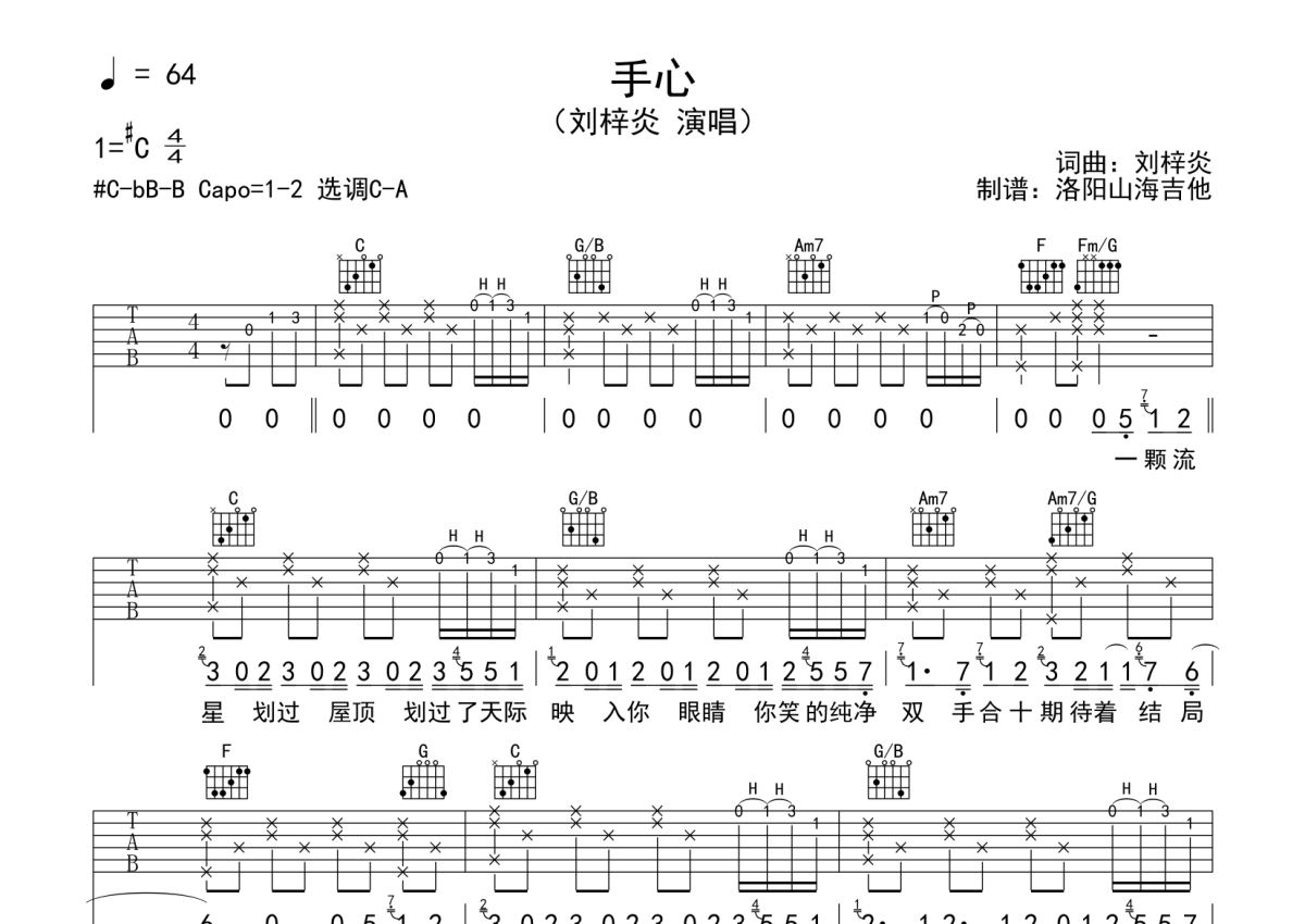 刘梓炎《手心》吉他谱 - C调弹唱六线谱