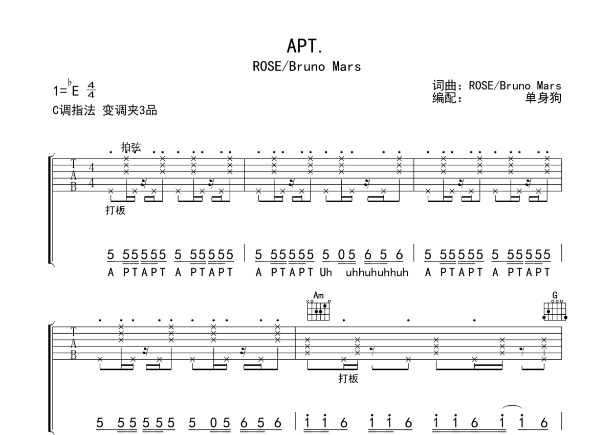 《APT.》是ROSE/Bruno Mars演唱的一首歌曲,拍号为4/4拍,歌曲原调为Eb调,但由于原调指法比较难,为了方便弹奏,本吉他谱采用的是C调指法编配,变调夹3品弹奏即为原调,当然也可以根据自己的音域改变变调夹位置,或者通过改变和弦调性,以方便自己弹奏,这份吉他谱共有五张高清图谱,图谱由 @单身狗 编配上传,图谱使用六线谱编配,包含吉他和弦指法、简谱以及歌词部分,使用这份APT.吉他谱,可以让你更加方便地掌握这首歌曲的弹唱技巧,快来尝试吧。