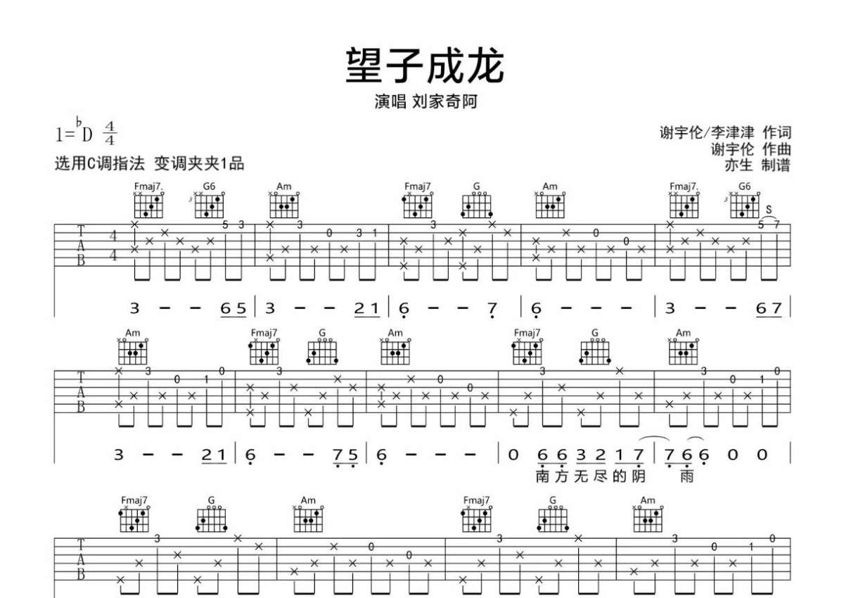 《望子成龙》是刘家奇阿演唱的一首歌曲,拍号为4/4拍,歌曲原调为Db调,但由于原调指法比较难,为了方便弹奏,本吉他谱采用的是C调指法编配,变调夹1品弹奏即为原调,当然也可以根据自己的音域改变变调夹位置,或者通过改变和弦调性,以方便自己弹奏,这份吉他谱共有三张高清图谱,图谱由 @亦生 编配上传,图谱使用六线谱编配,包含吉他和弦指法、简谱以及歌词部分,使用这份望子成龙吉他谱,可以让你更加方便地掌握这首歌曲的弹唱技巧,快来尝试吧。