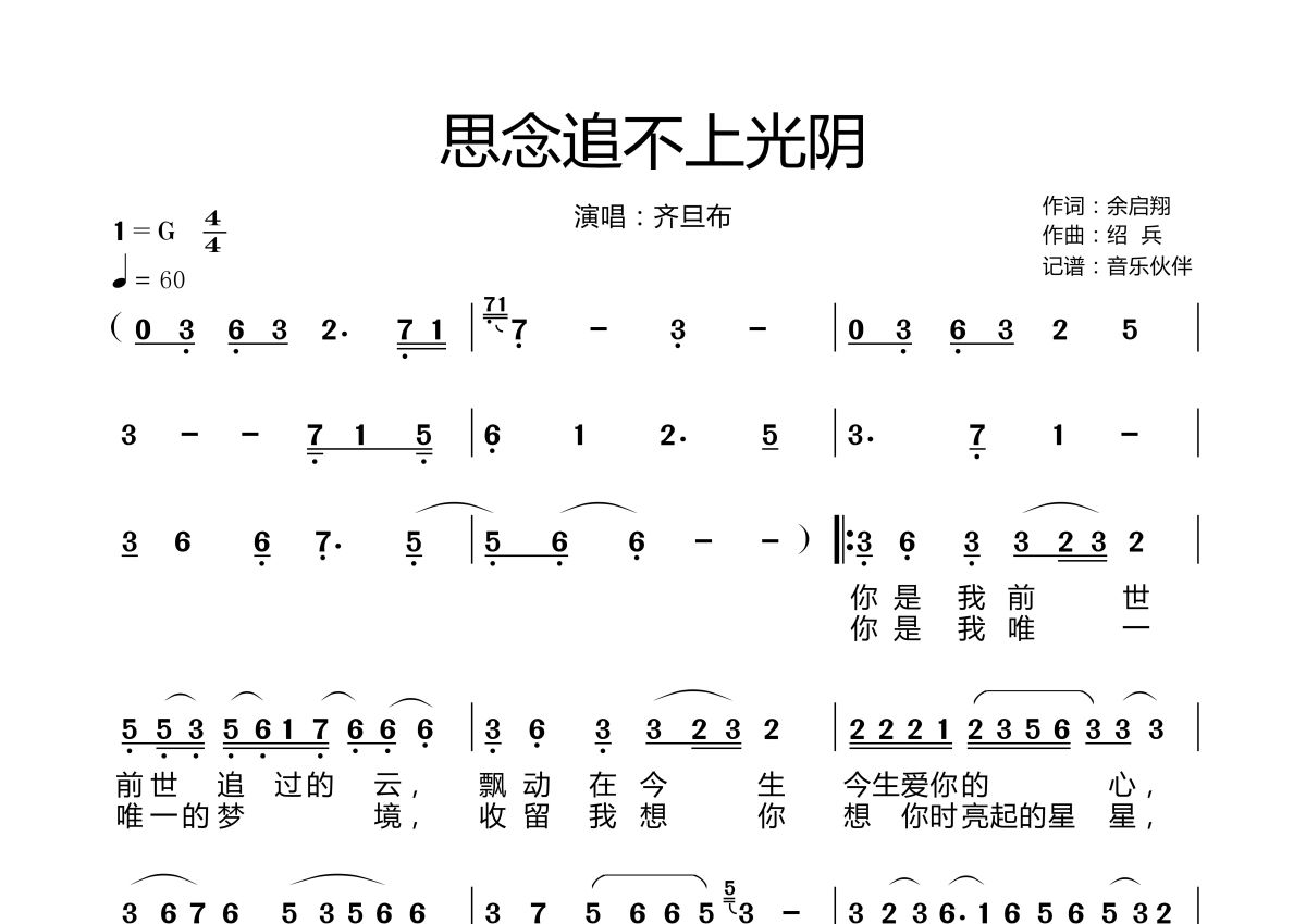 《思念追不上光阴》是齐旦布演唱的一首歌曲,拍号为4/4拍,歌曲速度为每分钟60拍,这份简谱共有两张高清图谱,图谱由 @音乐伙伴 编配上传。