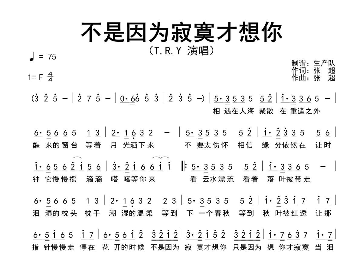 《不是因为寂寞才想你》是T.R.Y演唱的一首歌曲,原版简谱,拍号为4/4拍,歌曲速度为每分钟75拍,这份简谱共有一张高清图谱,图谱由 @生产队 编配上传T.R.Y演唱的经典歌曲《不是因为寂寞才想你》原版简谱,完整的前奏、间奏、尾奏solo编配。