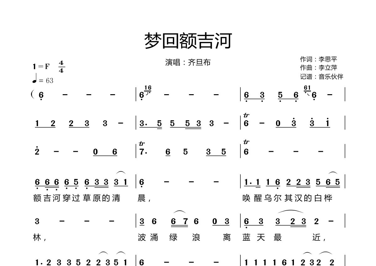 《梦回额吉河》是齐旦布演唱的一首歌曲,拍号为4/4拍,歌曲速度为每分钟63拍,这份简谱共有两张高清图谱,图谱由 @音乐伙伴 编配上传。