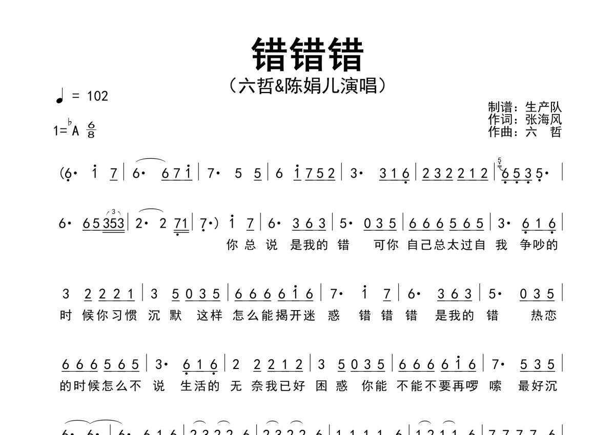 《错错错》是六哲&陈娟儿演唱的一首歌曲,原版简谱,拍号为6/8拍,歌曲速度为每分钟102拍,这份简谱共有两张高清图谱,图谱由 @生产队 编配上传六哲&陈娟儿演唱的经典歌曲《错错错》原版简谱,完整的前奏、间奏、尾奏solo编配。