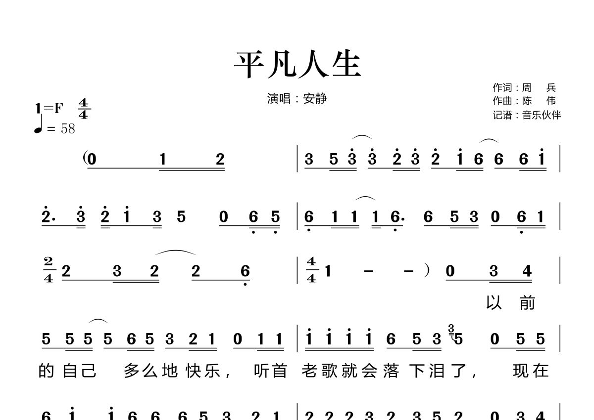 《平凡人生》是安静演唱的一首歌曲,这份简谱共有两张高清图谱,图谱由 @音乐伙伴 编配上传。