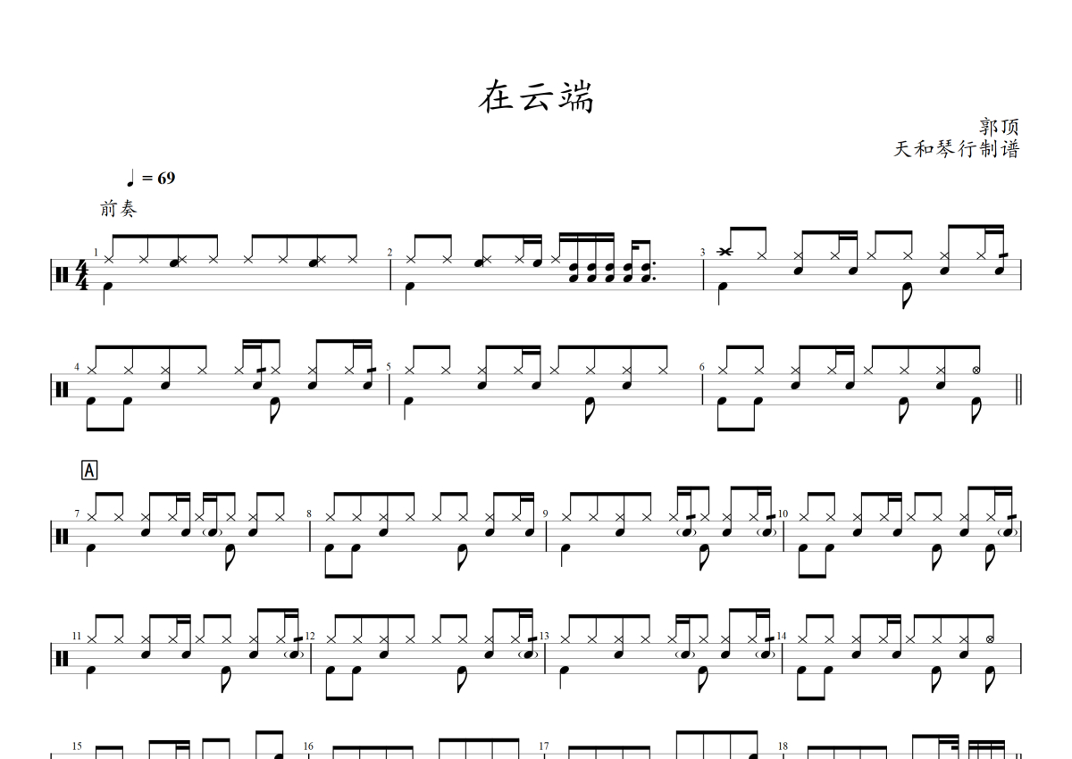 《在云端》是郭顶演唱的一首歌曲,拍号为4/4拍,歌曲速度为每分钟69拍,这份架子鼓谱共有两张高清图谱,图谱由 @音符喷血者 编配上传,图谱使用五线谱编配,使用这份在云端架子鼓谱,你将能够轻松地敲打出这首郭顶的在云端,快来尝试吧。
