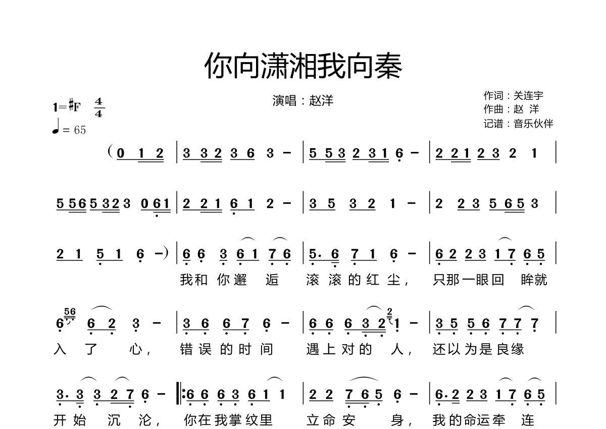 《你向潇湘我向秦》是赵洋演唱的一首歌曲,拍号为4/4拍,歌曲速度为每分钟65拍,这份简谱共有两张高清图谱,图谱由 @音乐伙伴 编配上传。