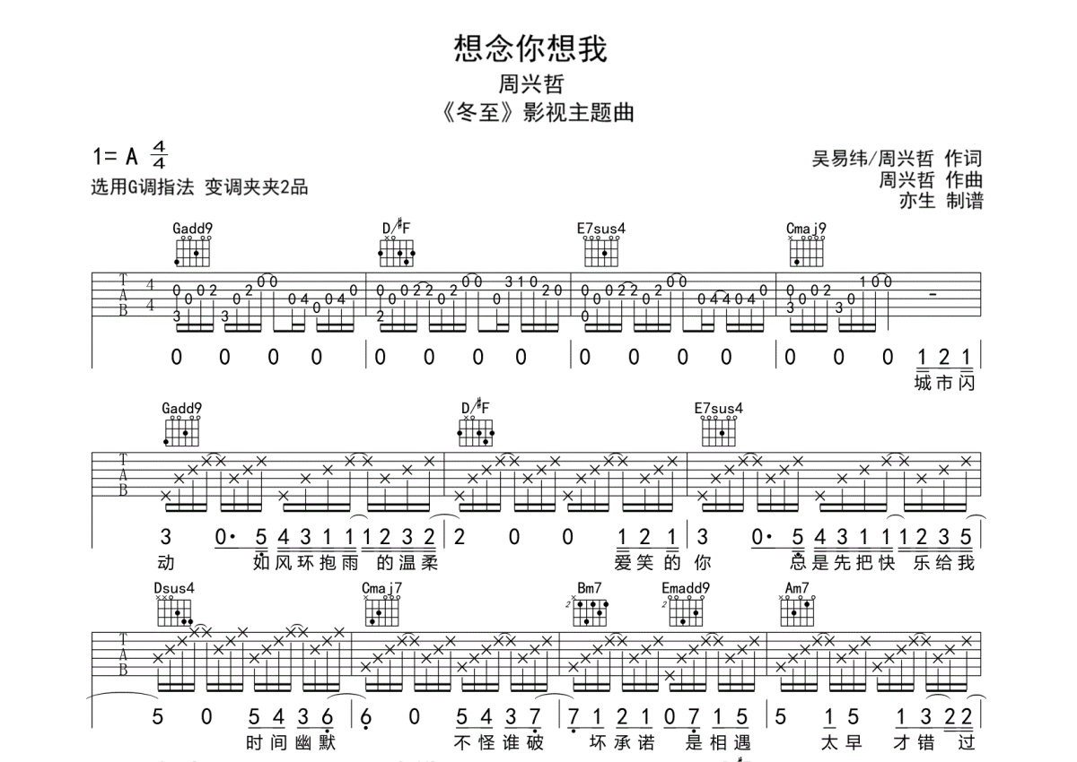 《想念你想我》是周兴哲演唱的一首歌曲,拍号为4/4拍,歌曲原调为G调,本吉他谱采用的是G调指法编配,变调夹2品弹奏即为原调,当然也可以根据自己的音域改变变调夹位置,或者通过改变和弦调性,以方便自己弹奏,这份吉他谱共有三张高清图谱,图谱由 @亦生 编配上传,图谱使用六线谱编配,包含吉他和弦指法、简谱以及歌词部分,使用这份想念你想我吉他谱,可以让你更加方便地掌握这首歌曲的弹唱技巧,快来尝试吧。