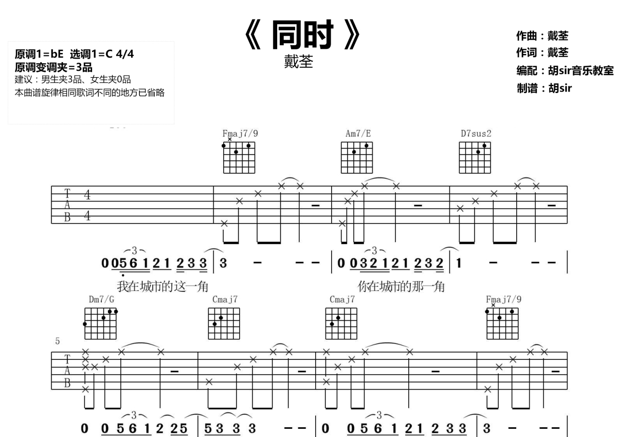 《同时》是戴荃演唱的一首歌曲,本吉他谱采用的是C调指法编配,这份吉他谱共有三张高清图谱,图谱由 @胡sir音乐 编配上传,图谱使用六线谱编配,包含吉他和弦指法、简谱以及歌词部分,使用这份同时吉他谱,可以让你更加方便地掌握这首歌曲的弹唱技巧,快来尝试吧。戴荃《同时》吉他谱,原调bE,原调变调夹夹第三品,选调C,建议男生夹3品,女生不夹;