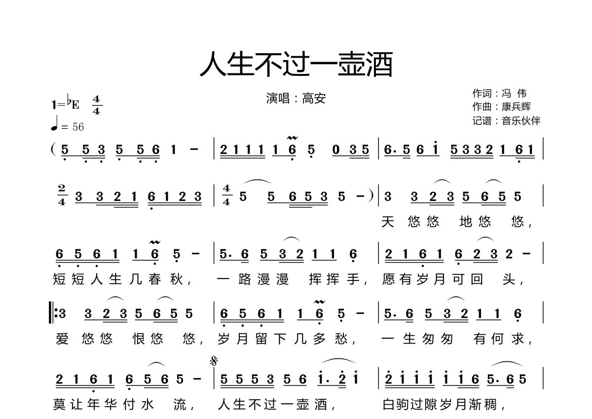 《人生不过一壶酒》是高安演唱的一首歌曲,拍号为4/4拍,歌曲速度为每分钟56拍,这份简谱共有一张高清图谱,图谱由 @音乐伙伴 编配上传。