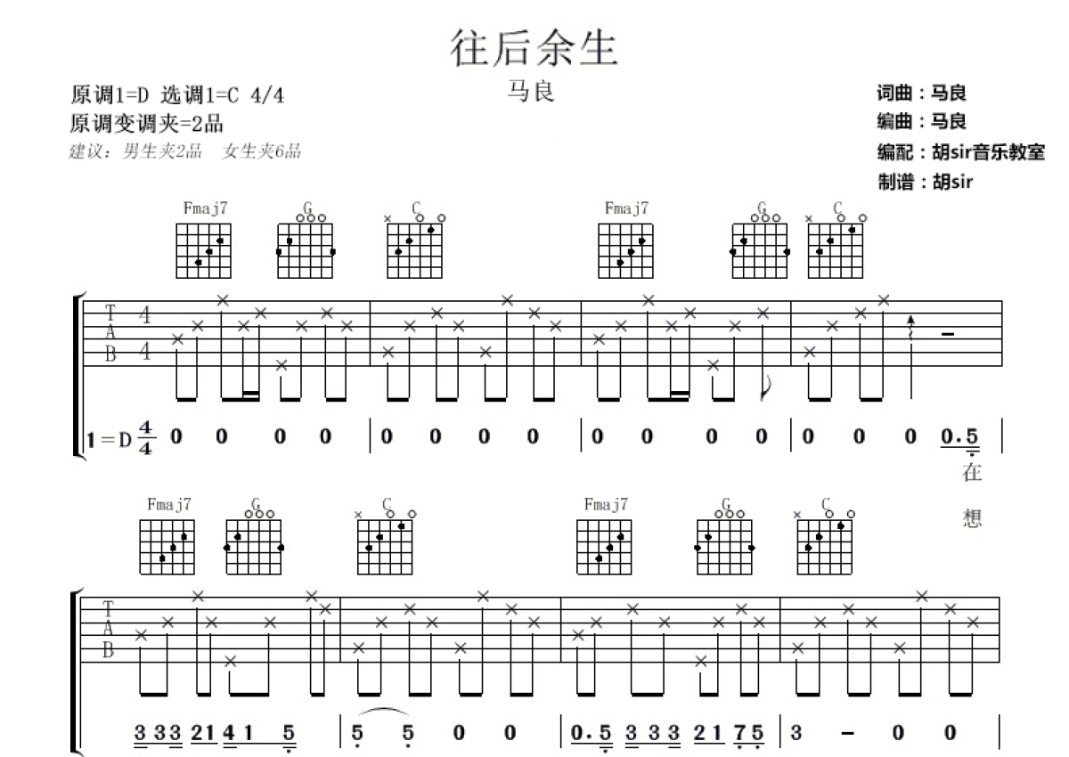 《往后余生》是马良演唱的一首歌曲,本吉他谱采用的是C调指法编配,这份吉他谱共有两张高清图谱,图谱由 @胡sir音乐 编配上传,图谱使用六线谱编配,包含吉他和弦指法、简谱以及歌词部分,使用这份往后余生吉他谱,可以让你更加方便地掌握这首歌曲的弹唱技巧,快来尝试吧。往后余生吉他谱,马良演唱《往后余生》六线谱,原调D,选用C调指法,男生变调夹建议夹2品,女生变调夹建议夹6品,往后余生里回忆里全部都是你,还可能是往后余生希望有个这样的你,看人看境遇看歌唱时是什么样的心情。你会不会也和我一样,听得心生欢喜呢?。