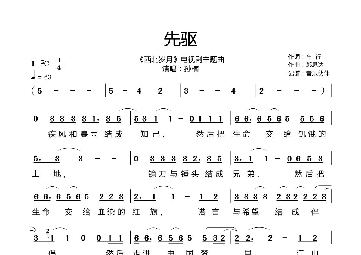 《先驱》是孙楠演唱的一首歌曲,拍号为4/4拍,歌曲速度为每分钟63拍,这份简谱共有两张高清图谱,图谱由 @音乐伙伴 编配上传《西北岁月》电视剧主题曲。