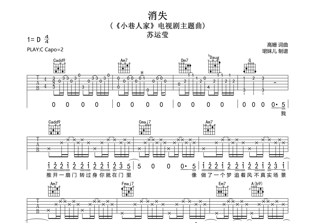 《消失》是苏运莹演唱的一首歌曲,拍号为4/4拍,歌曲速度为每分钟85拍,歌曲原调为C调,本吉他谱采用的是C调指法编配,变调夹2品弹奏即为原调,当然也可以根据自己的音域改变变调夹位置,或者通过改变和弦调性,以方便自己弹奏,这份吉他谱共有两张高清图谱,图谱由 @珺妹儿 编配上传,图谱使用六线谱编配,包含吉他和弦指法、简谱以及歌词部分,使用这份消失吉他谱,可以让你更加方便地掌握这首歌曲的弹唱技巧,快来尝试吧。