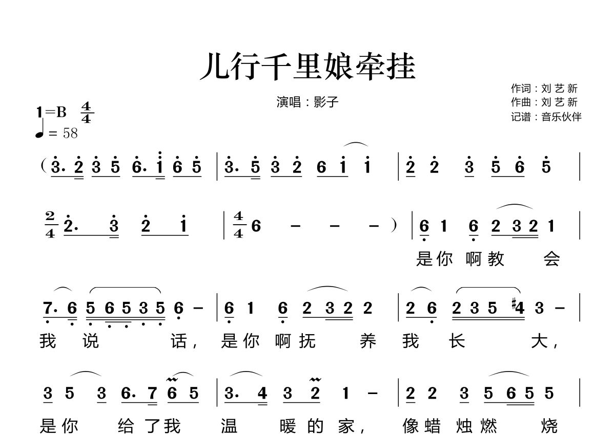《儿行千里娘牵挂》是影子演唱的一首歌曲,拍号为4/4拍,这份简谱共有两张高清图谱,图谱由 @音乐伙伴 编配上传。