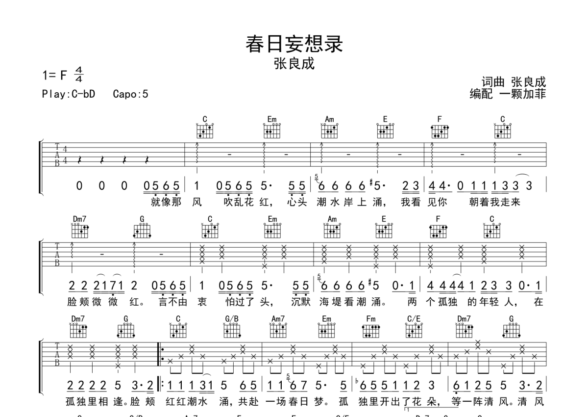 张良成《春日妄想录》吉他谱 - C调弹唱六线谱