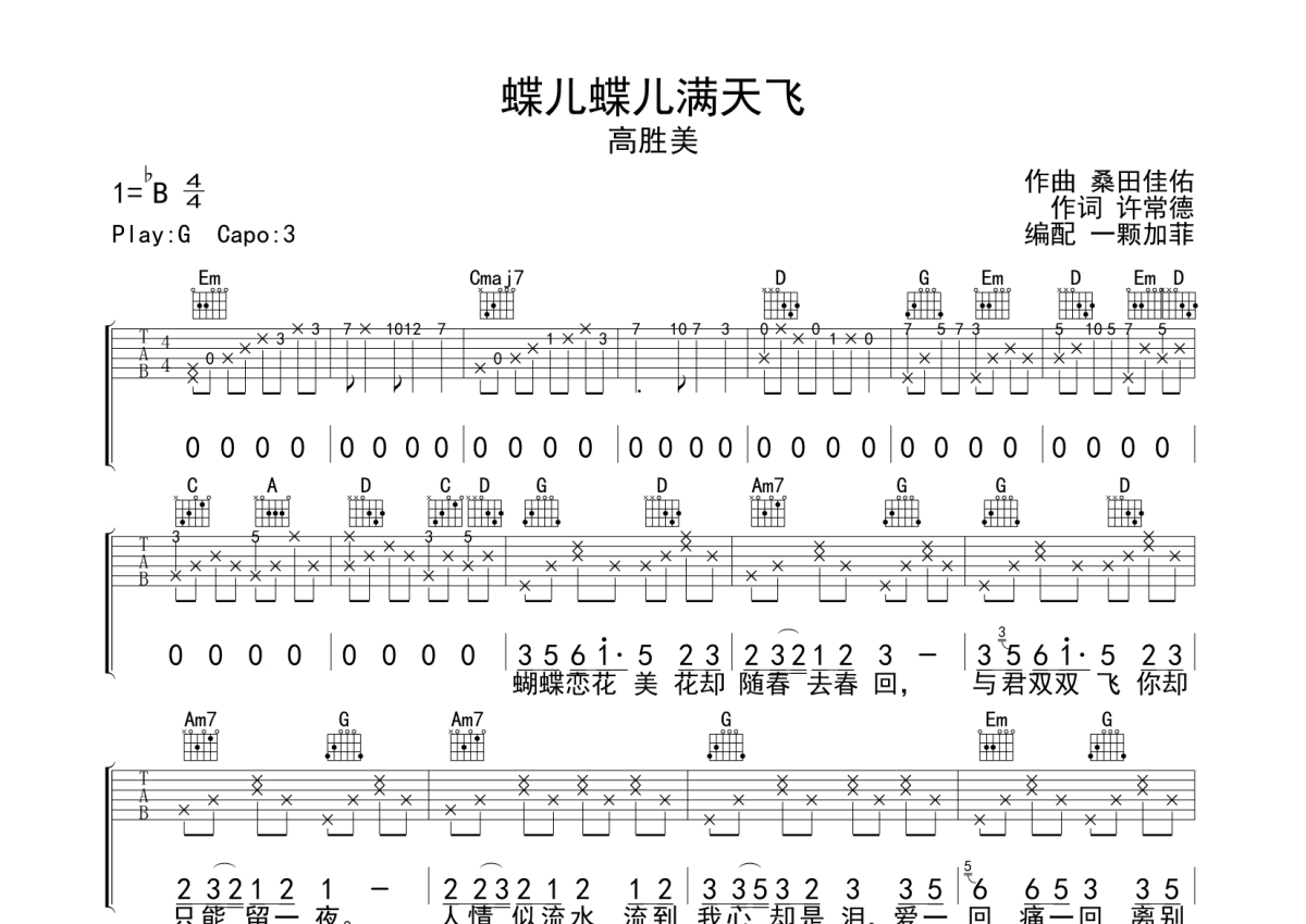 《蝶儿蝶儿满天飞》是高胜美演唱的一首歌曲,拍号为4/4拍,歌曲原调为Bb调,但由于原调指法比较难,为了方便弹奏,本吉他谱采用的是G调指法编配,变调夹3品弹奏即为原调,当然也可以根据自己的音域改变变调夹位置,或者通过改变和弦调性,以方便自己弹奏,这份吉他谱共有两张高清图谱,图谱由 @一颗加菲 编配上传,图谱使用六线谱编配,包含吉他和弦指法、简谱以及歌词部分,曲谱配备了相关的音频提供试听,使用这份蝶儿蝶儿满天飞吉他谱,可以让你更加方便地掌握这首歌曲的弹唱技巧,快来尝试吧。