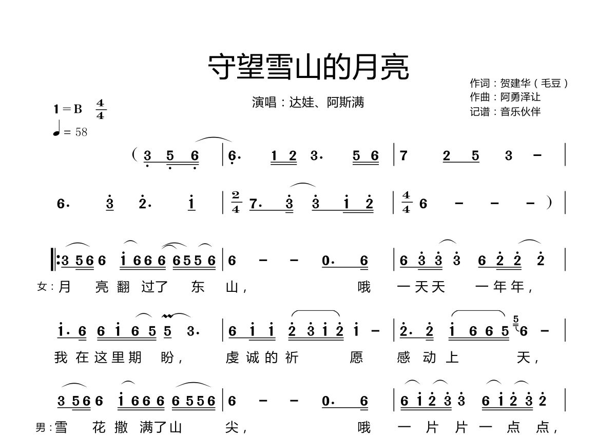 守望雪山的月亮简谱 - 达娃&阿斯满演唱
