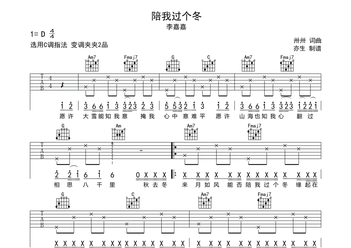 陪我过个冬吉他谱 - 李嘉嘉演唱 - C调弹唱六线谱
