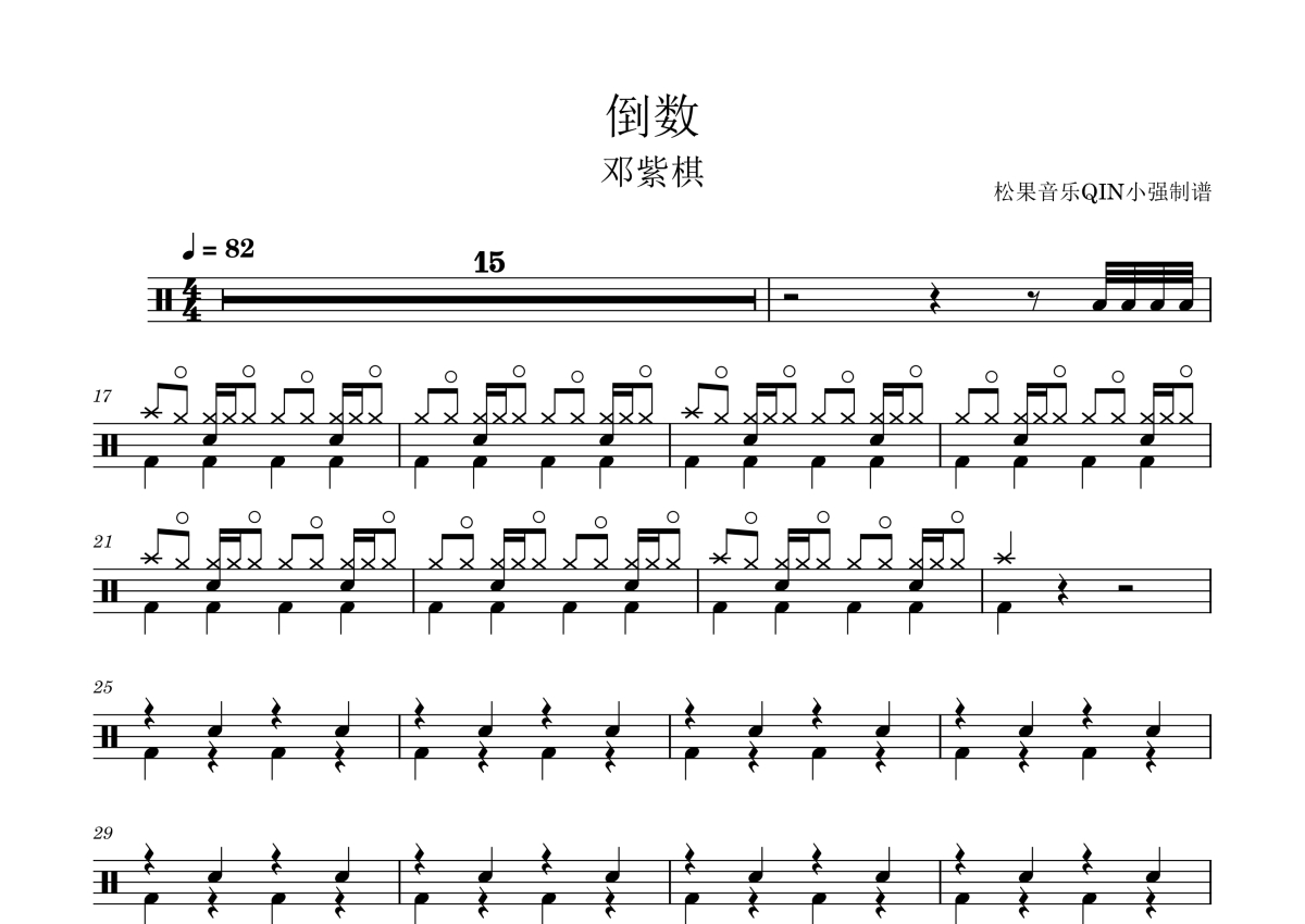 《倒数》是邓紫棋演唱的一首歌曲,拍号为4/4拍,这份架子鼓谱共有两张高清图谱,图谱由 @松果音乐QIN小强 编配上传,图谱使用五线谱编配,使用这份倒数架子鼓谱,你将能够轻松地敲打出这首邓紫棋的倒数,快来尝试吧。《倒数》是邓紫棋演唱的歌曲,由邓紫棋作词,邓紫棋、Lupo Groinig作曲,收录于邓紫棋2018年8月16日发行的音乐EP《另一个童话》中。