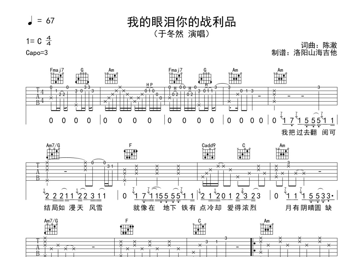 于冬然《我的眼泪你的战利品》吉他谱 - C调弹唱六线谱