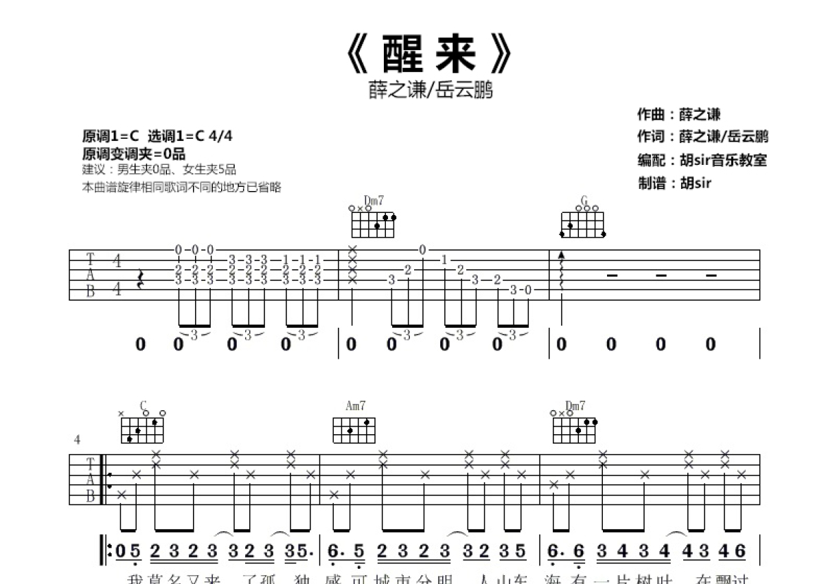 《醒来》是薛之谦/岳云鹏演唱的一首歌曲,本吉他谱采用的是C调指法编配,这份吉他谱共有三张高清图谱,图谱由 @胡sir音乐 编配上传,图谱使用六线谱编配,包含吉他和弦指法、简谱以及歌词部分,使用这份醒来吉他谱,可以让你更加方便地掌握这首歌曲的弹唱技巧,快来尝试吧。醒来吉他谱,薛之谦岳云鹏演唱,C调指法,女生变调夹推荐第五品,醒来吉他弹唱谱
