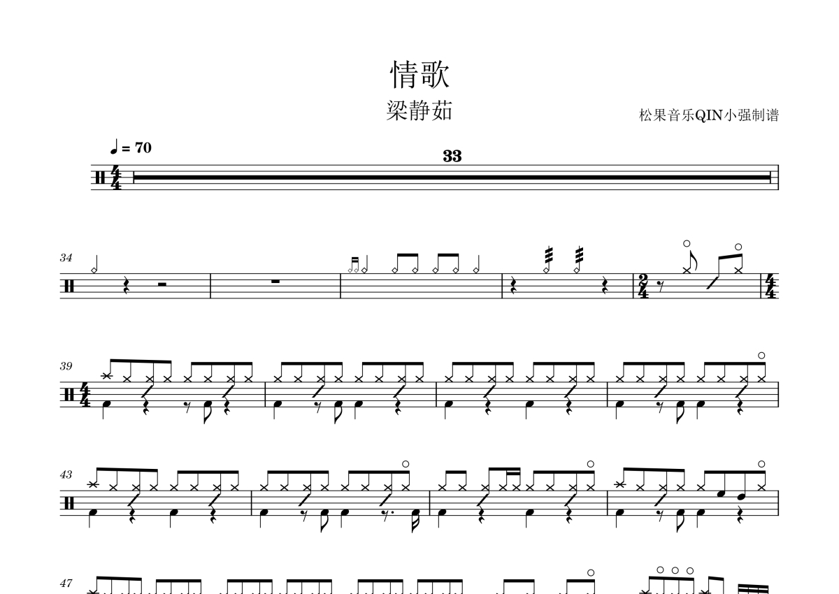 《情歌》是梁静茹演唱的一首歌曲,拍号为4/4拍,这份架子鼓谱共有一张高清图谱,图谱由 @松果音乐QIN小强 编配上传,图谱使用五线谱编配,使用这份情歌架子鼓谱,你将能够轻松地敲打出这首梁静茹的情歌,快来尝试吧。《情歌》是陈没填词,伍冠谚谱曲,梁静茹演唱的一首情歌,收录在梁静茹第十张专辑《静茹&情歌—别再为他流泪》中,同时也是2009年中国台湾青春偶像剧《败犬女王》的插曲。