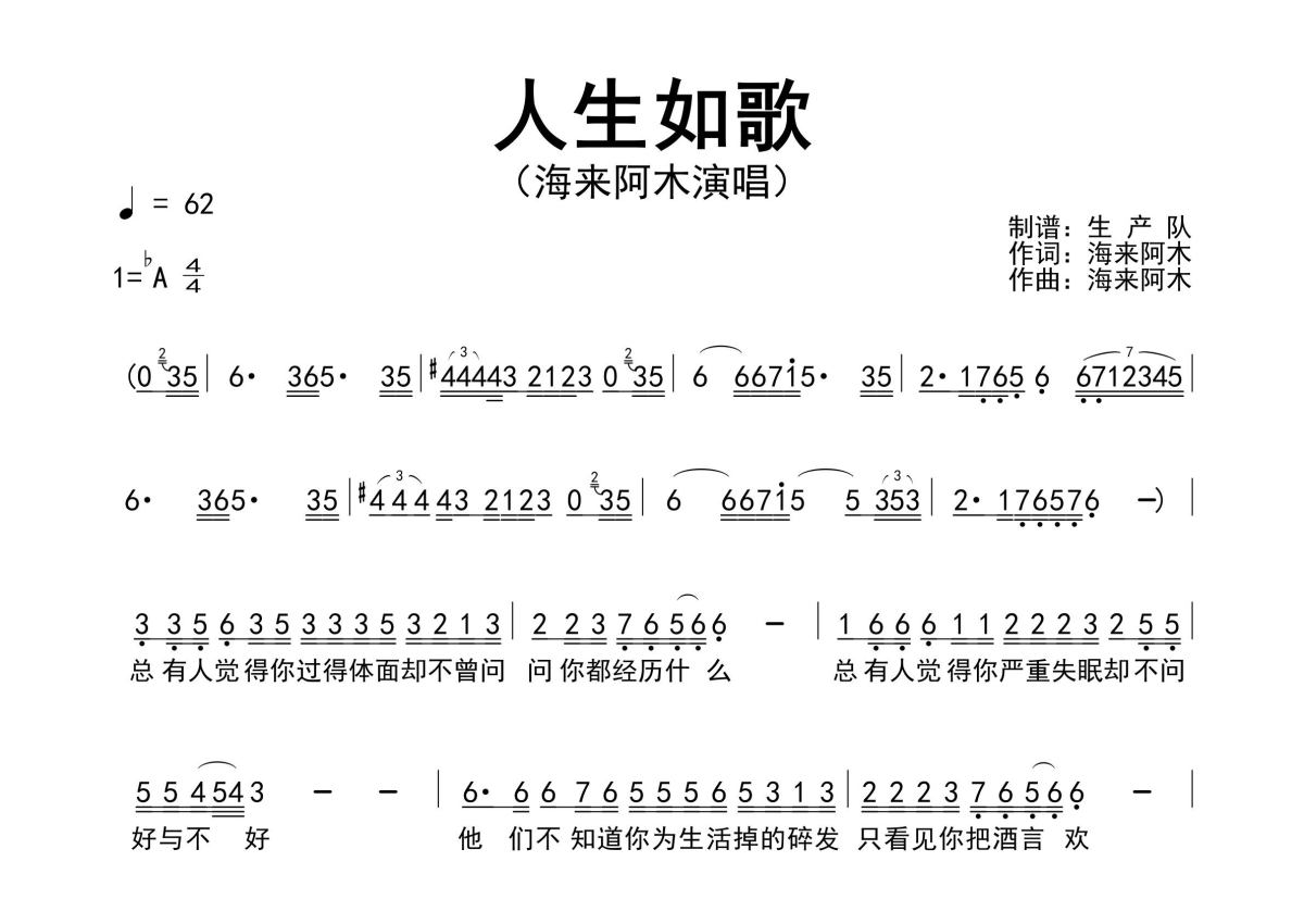 《人生如歌》是海来阿木演唱的一首歌曲,原版简谱,拍号为4/4拍,歌曲速度为每分钟62拍,这份简谱共有两张高清图谱,图谱由 @生产队 编配上传海来阿木作词、作曲并演唱的歌曲《人生如歌》原版简谱,完整的前奏、间奏solo编配。