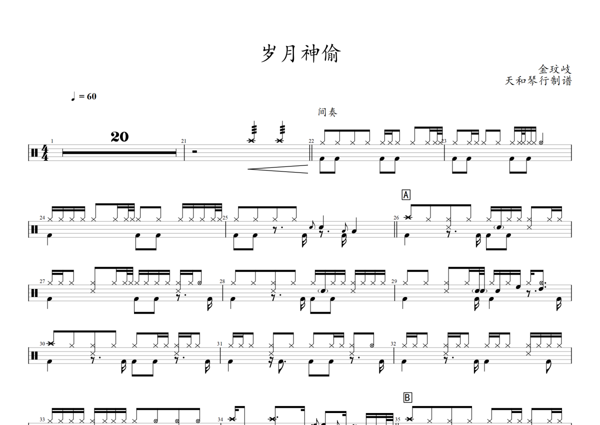 《岁月神偷》是金玟岐演唱的一首歌曲,拍号为4/4拍,歌曲速度为每分钟60拍,这份架子鼓谱共有一张高清图谱,图谱由 @音符喷血者 编配上传,图谱使用五线谱编配,使用这份岁月神偷架子鼓谱,你将能够轻松地敲打出这首金玟岐的岁月神偷,快来尝试吧。