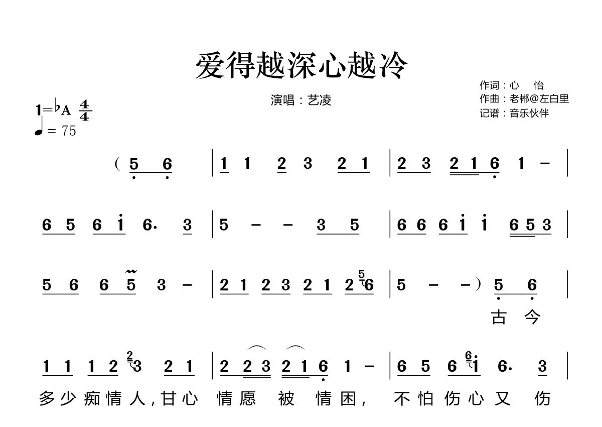 《爱得越深心越冷》是艺凌演唱的一首歌曲,这份简谱共有两张高清图谱,图谱由 @音乐伙伴 编配上传。