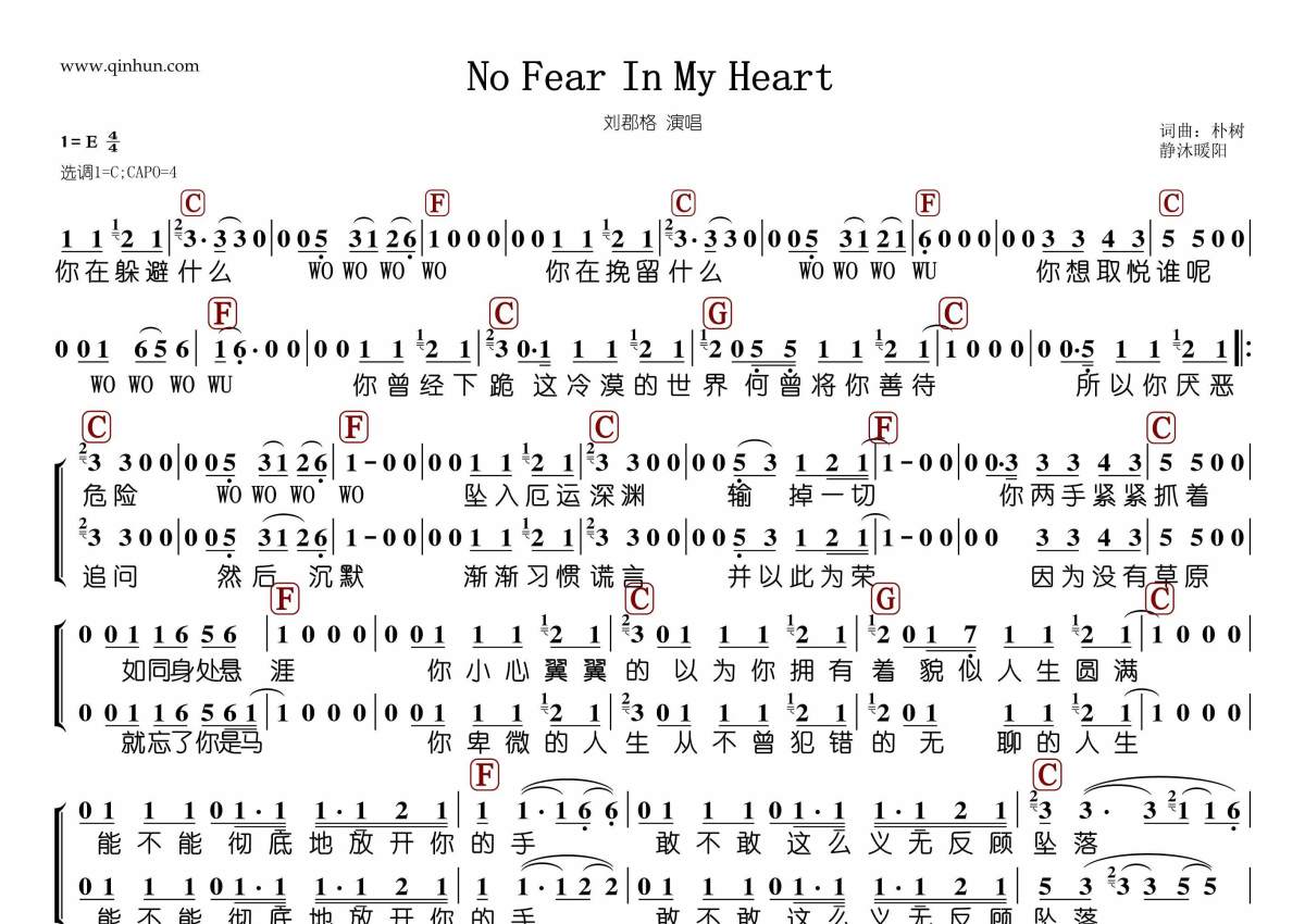 《No Fear In My Heart》是刘郡格演唱的一首歌曲,和弦谱,拍号为4/4拍,这份简谱共有一张高清图谱,图谱由 @静沐暖阳 编配上传。