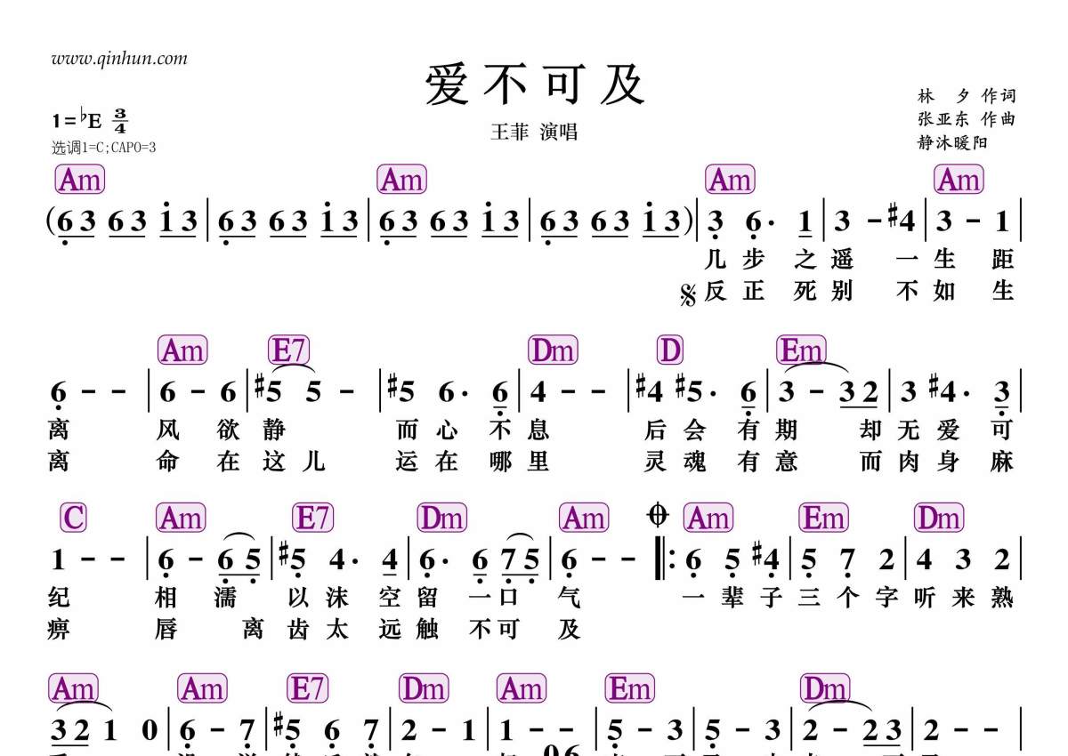 《爱不可及》是王菲演唱的一首歌曲,和弦谱,拍号为3/4拍,这份简谱共有一张高清图谱,图谱由 @静沐暖阳 编配上传。