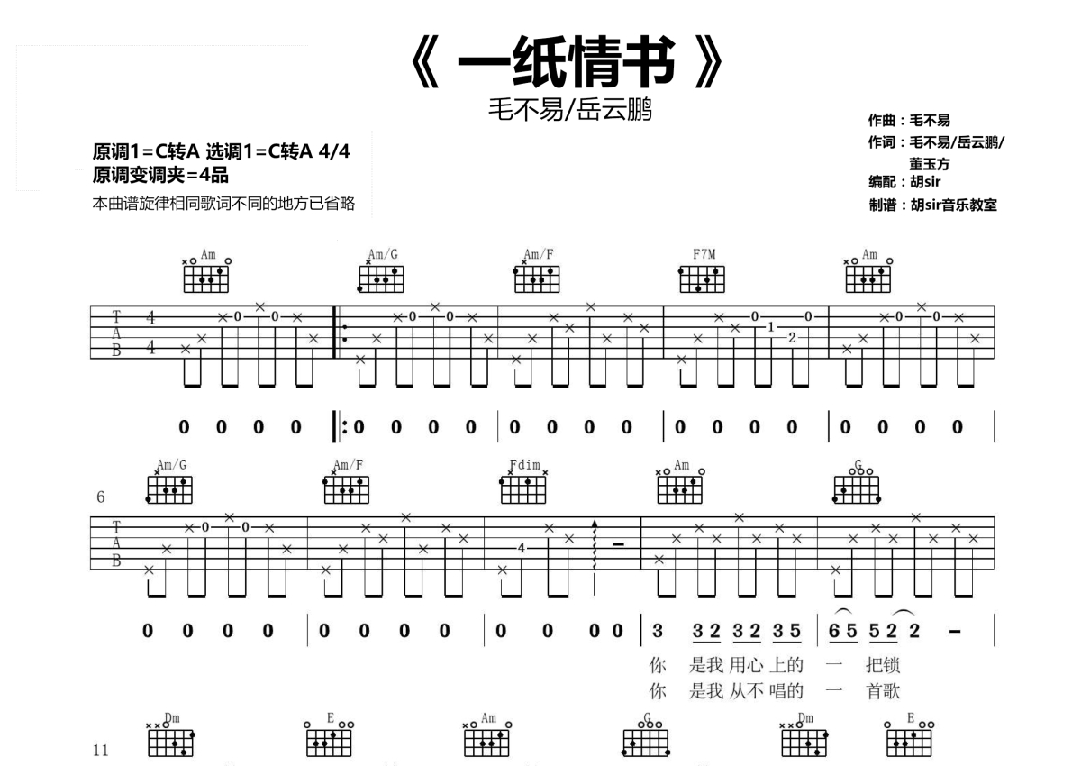 毛不易岳云鹏《一纸情书》吉他谱,《无限歌谣季》歌曲,原调C转A调,变调夹夹四品