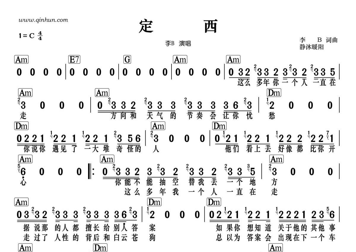 《定西》是李志演唱的一首歌曲,拍号为4/4拍,这份简谱共有一张高清图谱,图谱由 @静沐暖阳 编配上传。