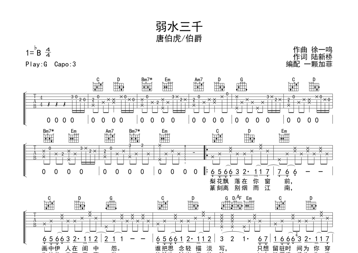 《弱水三千》是唐伯虎演唱的一首歌曲,拍号为4/4拍,歌曲原调为Bb调,但由于原调指法比较难,为了方便弹奏,本吉他谱采用的是G调指法编配,变调夹3品弹奏即为原调,当然也可以根据自己的音域改变变调夹位置,或者通过改变和弦调性,以方便自己弹奏,这份吉他谱共有两张高清图谱,图谱由 @一颗加菲 编配上传,图谱使用六线谱编配,包含吉他和弦指法、简谱以及歌词部分,曲谱配备了相关的音频提供试听,使用这份弱水三千吉他谱,可以让你更加方便地掌握这首歌曲的弹唱技巧,快来尝试吧。