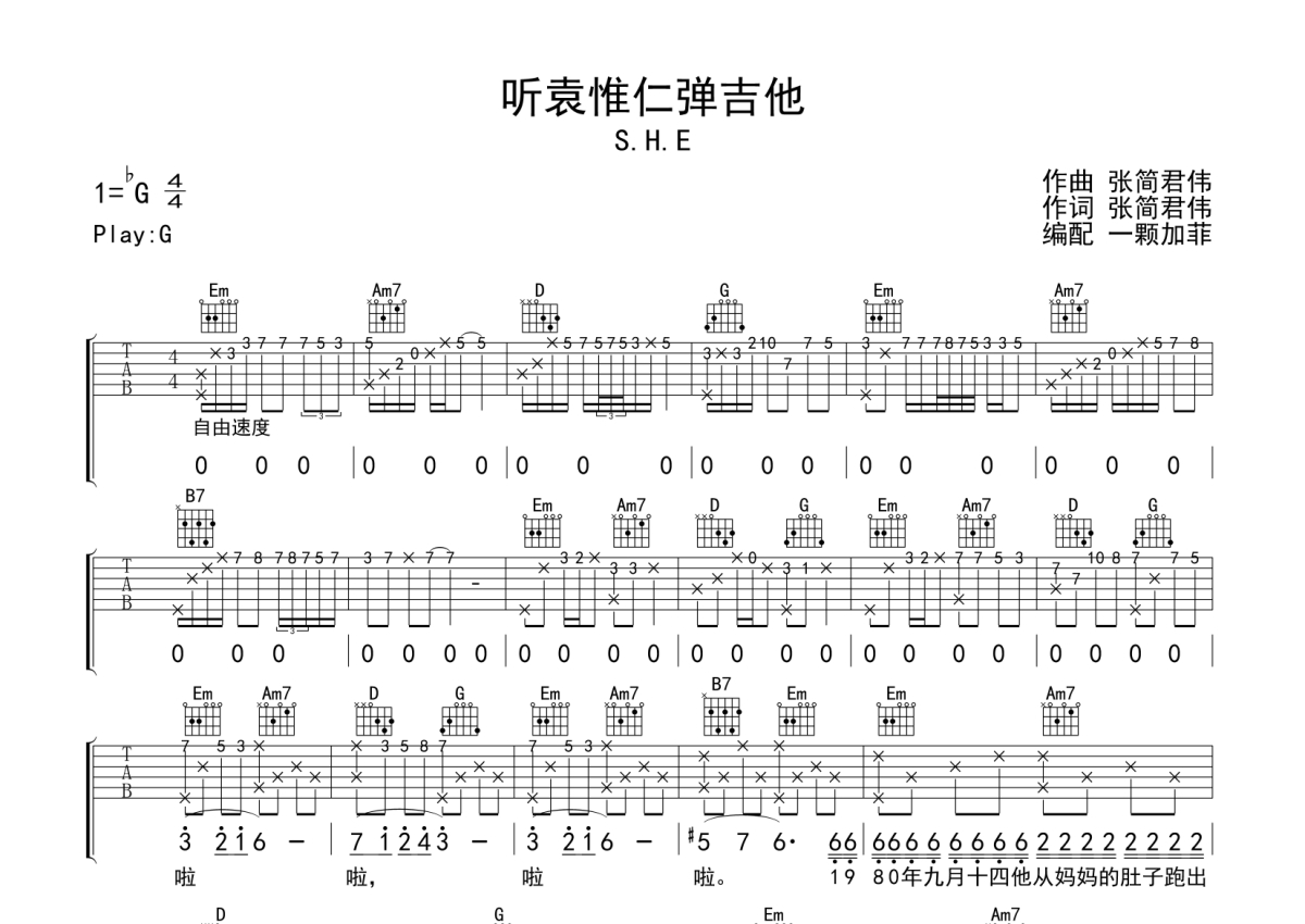 S.H.E《听袁惟仁弹吉他》吉他谱 - G调弹唱六线谱