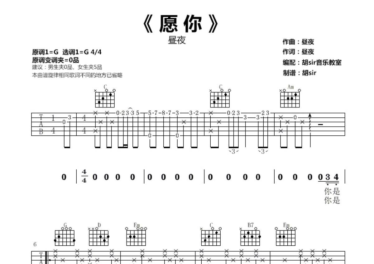 《愿你》是昼夜演唱的一首歌曲,本吉他谱采用的是G调指法编配,这份吉他谱共有两张高清图谱,图谱由 @胡sir音乐 编配上传,图谱使用六线谱编配,包含吉他和弦指法、简谱以及歌词部分,使用这份愿你吉他谱,可以让你更加方便地掌握这首歌曲的弹唱技巧,快来尝试吧。G调指法版,原调也是G调。 建议男生不夹,女生夹5品; 一首温暖的治愈系歌曲《愿你》,它每一句歌词的温柔,每一句歌词的鼓励,都让人舒服到心里。献给那些正在为自己梦想拼搏的人,无论是正在高三进入紧张备考的你,还是正在为了理想奋斗的你。生活是这样一件甘苦自知敝帚自珍的事情,你若愿苦其自身,才能掌声雷动。你就是自己的太阳,无需仰望别人的光芒。山川湖海囿于昼夜,愿你梦的远方,温暖为向。愿你所到之处,遍地阳光,愿你被这世界 温柔相待!。
