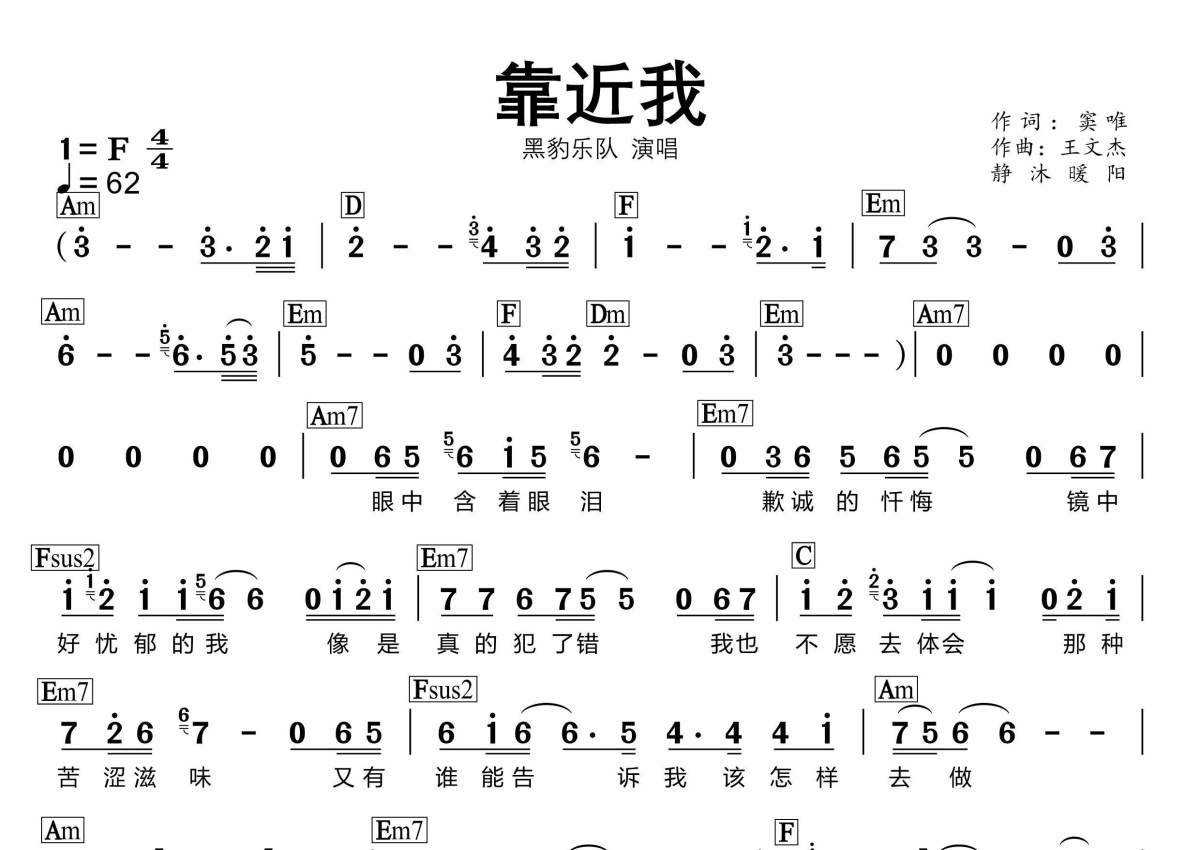 《靠近我》是黑豹乐队演唱的一首歌曲,和弦谱,拍号为4/4拍,歌曲速度为每分钟62拍,这份简谱共有一张高清图谱,图谱由 @静沐暖阳 编配上传。