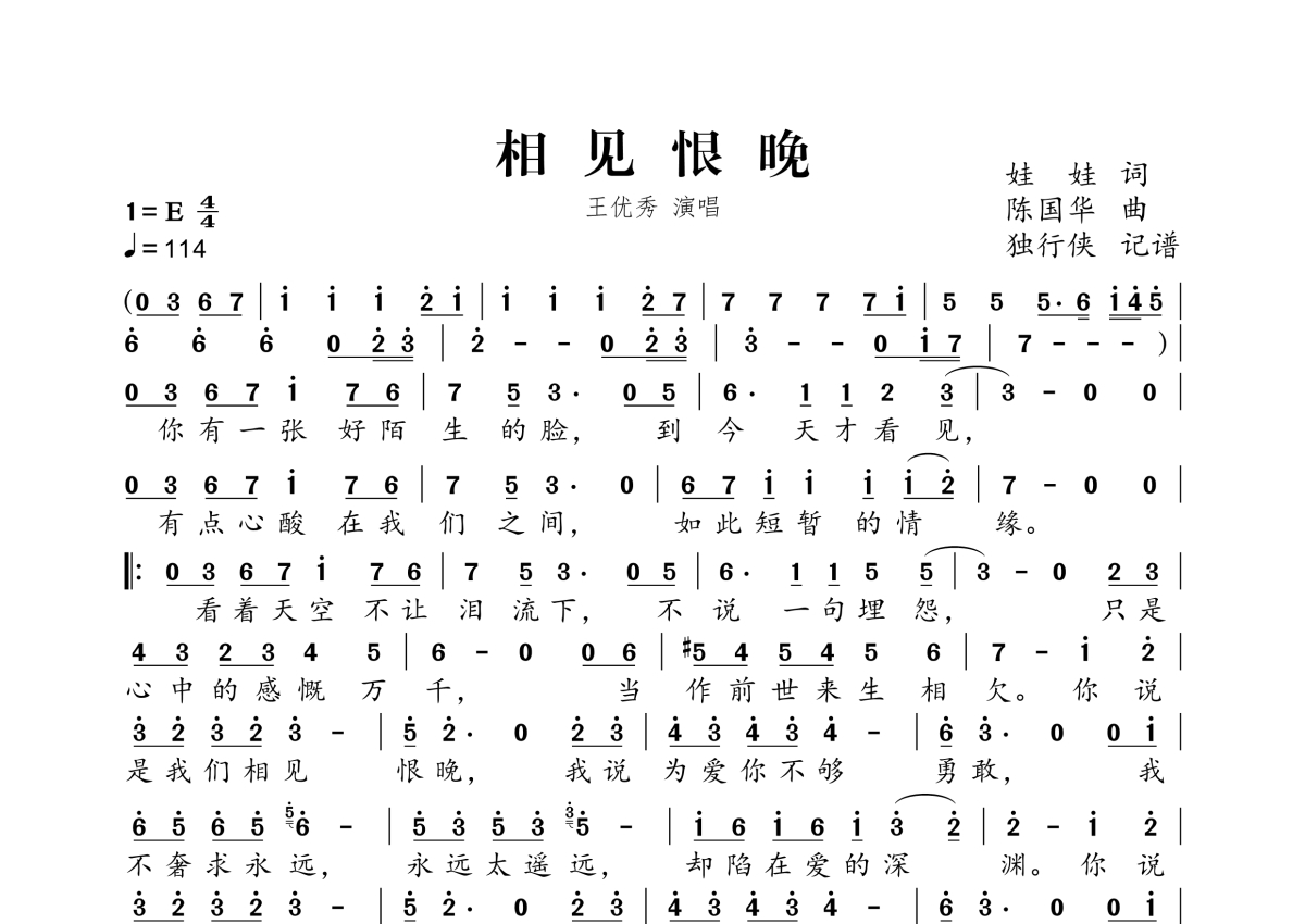 《相见恨晚》是王优秀演唱的一首歌曲,拍号为4/4拍,歌曲速度为每分钟114拍,这份简谱共有一张高清图谱,图谱由 @独行侠 编配上传。