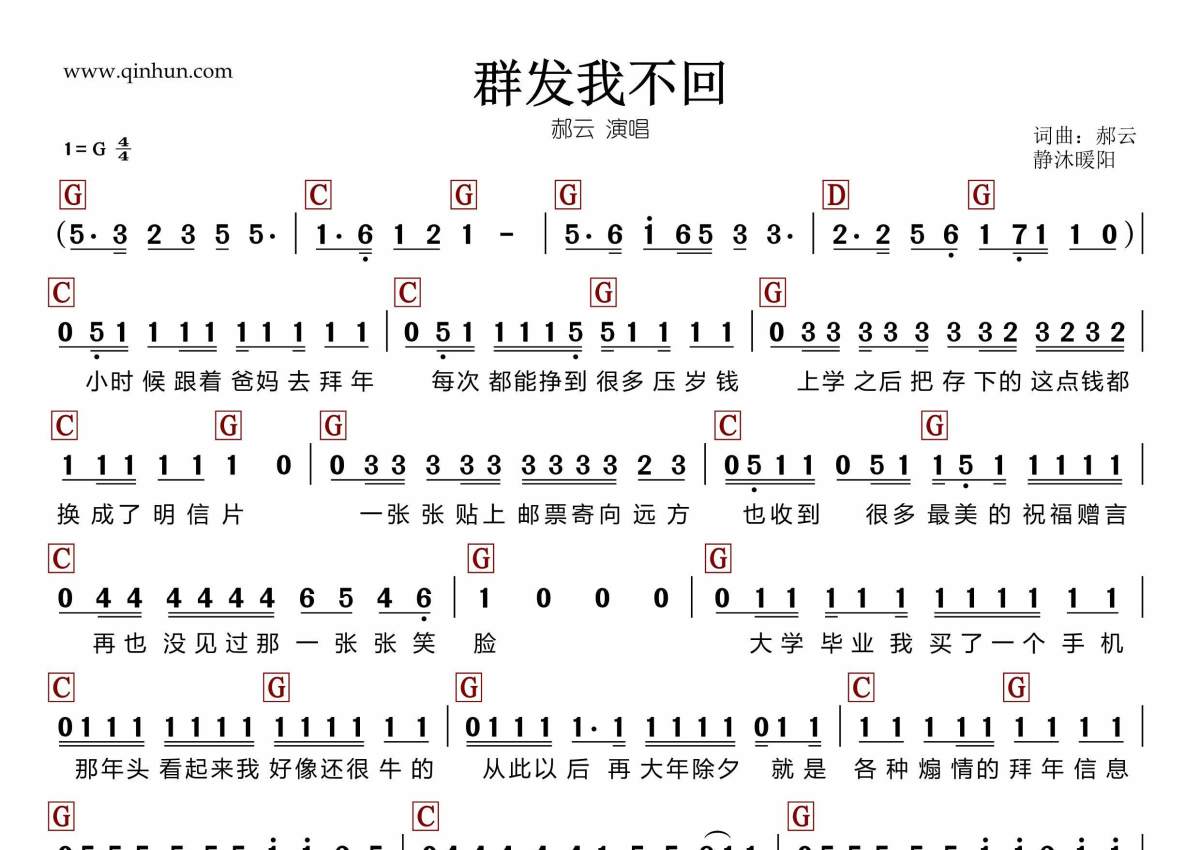 《群发我不回》是郝云演唱的一首歌曲,和弦谱,拍号为4/4拍,这份简谱共有一张高清图谱,图谱由 @静沐暖阳 编配上传。