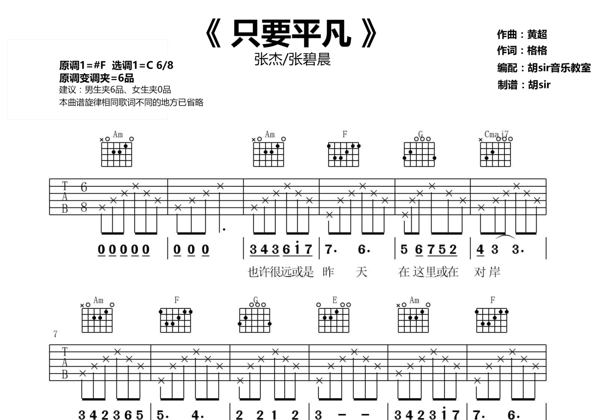 《只要平凡》是张杰/张碧晨演唱的一首歌曲,本吉他谱采用的是C调指法编配,这份吉他谱共有两张高清图谱,图谱由 @胡sir音乐 编配上传,图谱使用六线谱编配,包含吉他和弦指法、简谱以及歌词部分,使用这份只要平凡吉他谱,可以让你更加方便地掌握这首歌曲的弹唱技巧,快来尝试吧。由张杰张碧晨两位实力唱将为电影《我不是药神》献唱的《只要平凡》吉他谱分享,,原调#F,选调C,男生建议变调夹夹第六品,女生不夹。不要神的光环,只要你的平凡!返璞归真的唱腔,娓娓道来的方式,小人物的离合悲欢、人性的微光在浅唱低吟中,熠熠生辉,致敬平凡的小人物。