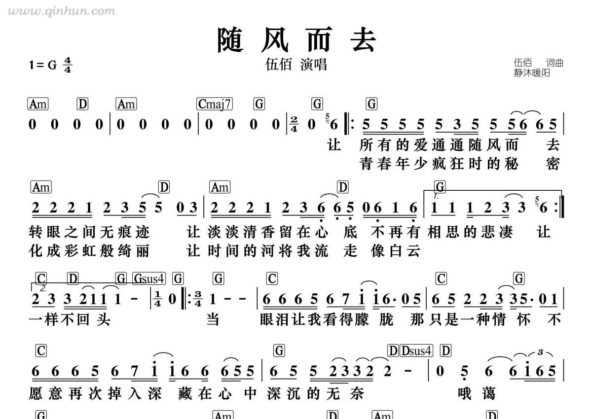 《随风而去》是伍佰演唱的一首歌曲,和弦谱,拍号为4/4拍,这份简谱共有一张高清图谱,图谱由 @静沐暖阳 编配上传G调。