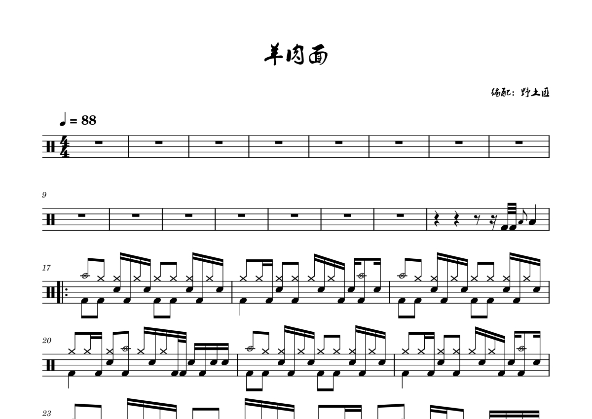 《羊肉面》是布衣乐队演唱的一首歌曲,拍号为4/4拍,歌曲速度为每分钟88拍,这份架子鼓谱共有两张高清图谱,图谱由 @野土匪 编配上传,图谱使用五线谱编配,使用这份羊肉面架子鼓谱,你将能够轻松地敲打出这首布衣乐队的羊肉面,快来尝试吧。